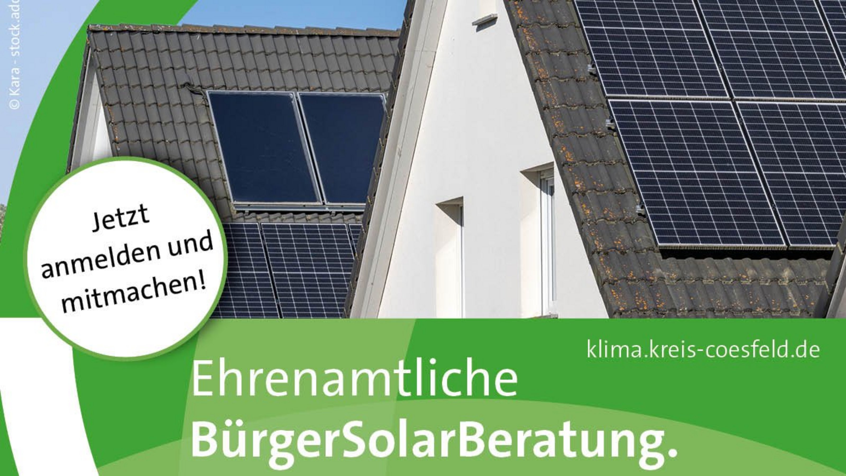 Vielfach benötigen Hauseigentümerinnen und Hauseigentümer mehr Informationen, wenn Sie in Erwägung ziehen, Solarstrom auf dem eigenen Dach zu produzieren. Um kostengünstige und kurze Wege aufzuzeigen, initiieren die Klimaschutzmanagerinnen und –manager im Kreis Coesfeld daher eine „BürgerSolarBeratung“: Interessierte Bürgerinnen und Bürger werden auf Kosten des Kreises und der Kommunen zu "Solarberatern geschult und können sich anschließend selbst organisieren und ehrenamtlich arbeiten.